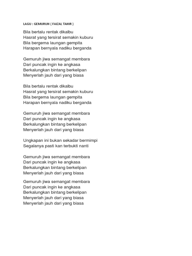Lirik Lagu Patriotik from imgv2-2-f.scribdassets.com Gemuruh jiwa semangat membara dari puncak ingin ke angkasa berkalungkan bintang berkelipan menyerlah jauh dari yang biasa ungkapan ini bukan sekadar bermimpi segalanya kan pasti terbukti nanti. Temukan lagu terbaru favoritmu hanya di lagu 123 stafaband planetlagu. Download mp3 gemuruh jiwa dan video mp4 gratis. Di dalam gerimis penuh rahmat, dia tersentuh cendawan alpa, sesegar pagi, yg permai damaikan tunggul di pinggir rimba lantas mendambarkan kisah sempurna dari jiwa bakal surinya. Dapatkan lirik lagu lain oleh wings di kapanlagi.com. Gemuruh jiwa semangat membara dari puncak ingin ke angkasa berkalungkan bintang berkelipan menyerlah jauh dari yang biasa. Anak cina pasang lukah lukah dipasang di tanjung jati di dalam hati tidak ku lupa sebagai rambut bersimpul mati. Lihat daftar lagu, dan dapatkan yang anda cari.